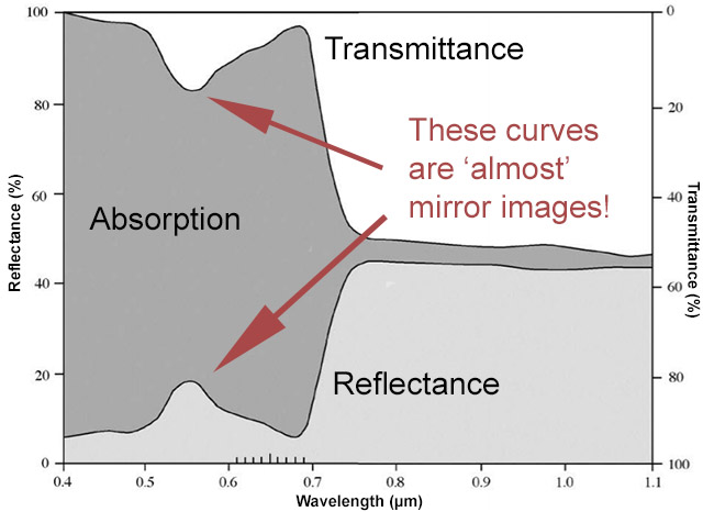 So index calculations ought to work with light that is transmitted through the leaves because the two curves contain very similar information. With the standard reflectance-based NDVI, ratings between 0 and 0.33 indicate unhealthy or stressed plants, 0.33 to 0.66 is moderately healthy, and 0.66 to 1 is very healthy. Flipping the calculation to a transmission-based version will shift those values significantly, but we can still use that trend as a rough guide to whether the method is working.