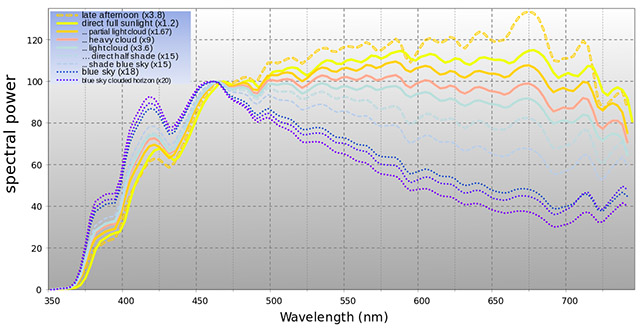 Most of us don’t have a benchtop source to play with so I’m going try this using sunlight. The variability of natural light is challenging, and the only thing that lets me use that LED band as a proxy for LUX is that intensity from 400-700nm is relatively consistent at the earths surface.