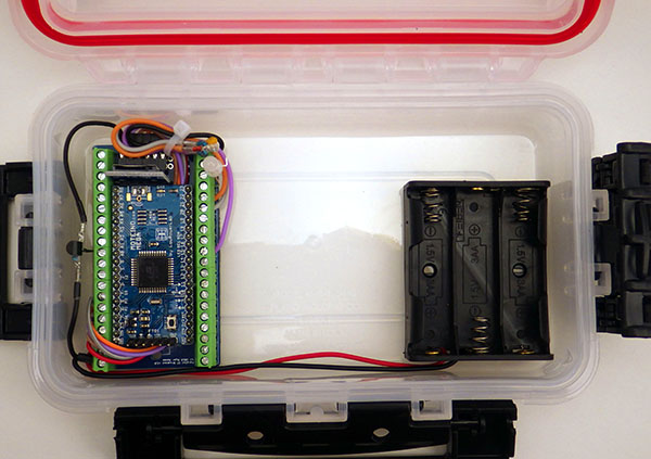 A capacitive touch switch works through the lid of the housing. This lets you do things like check the battery status without disturbing your experiment on long runs.