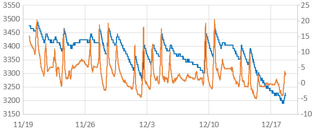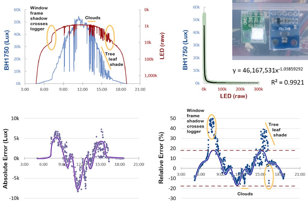 The logger was suspended in a south facing skylight window during these tests. Window frame shadow crossing events produce error spikes in opposite directions at ~6:30 am & pm, while wind-driven tree leaf shadows can produce errors in both directions from about 3:00 to 6:65 pm depending on whether the BH1750 or the LED is temporarily shaded. This was the least compromised location I could find in my urban environment.