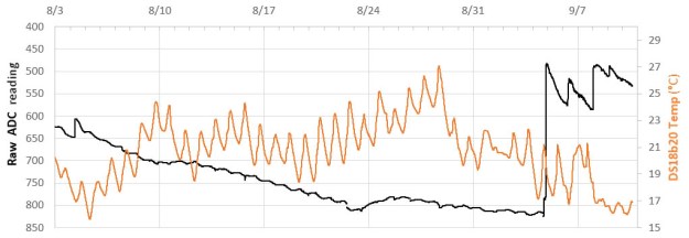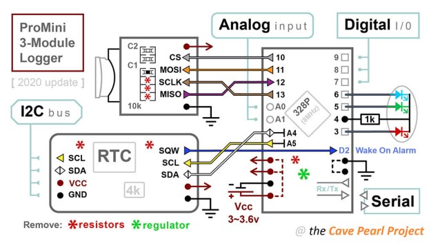 Note that the two interrupt sources use different triggers: FALLING for the TTP223, and LOW for the RTC. It doesn’t really affect anything if the switch transition is missed (you can just tap it again), but the whole logger operation is affected if the RTC alarm fails. The RTC must also be able to interrupt the ‘display time’. Fortunately the RTC’s alarm output is ‘latched’ so it will cascade the wake-ups until we exit the do-while loop. The most important thing to know when using HIGH or LOW as your interrupt state is that you MUST detach the interrupt IMMEDIATELY upon waking. If you forget to detach a HIGH or LOW triggered ISR it will just keep on firing until it fills all of the variable memory with stack pointers and crashes your logger.