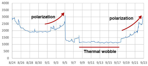 Bandgap voltages vary with temperature, changing the LED emission wavelength by ~ 0.1nm/°C. Detection wavelengths should follow suit, so it’s probably best to make sure the temperature varies as little as possible between our scale points and the target readings. Since the LED detectors are inside a Plano box, there is potential for some frequencies to be lost, but materials like high density polyethylene (HDPE) have remarkably smooth absorption curves that don’t become extreme until you reach UV. The fact that Vi’s are ‘a ratio of ratios’ means that we have to compare the raw sensor readings to direct insulation values before the index can be calculated. Housing losses should affect the high reference and the target readings in the same way, so it should not throw off the final index – essentially we treat it like transmittance loss in the atmosphere. And I need to use a desiccant because this is a capacitance – discharge method, so things like ambient humidity could affect the capacitance.