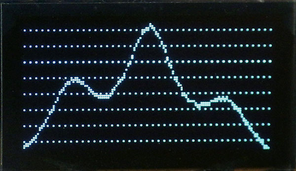 I’m only including the print statements for one line of the the display shown here -> (click to enlarge) but hopefully you see the pattern well enough to lather-rinse-repeat. The pixels do not need to be ‘turned on’ while you load the screen memory, and that data is persistent as long as the screen has power. So if you wanted to tackle more advanced graphic output, you could build plots ‘one line at a time’ in the eeprom without needing a 127 field array to buffer that data.