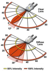 Relative luminous intensity versus angular displacement. from: Broadcom Datasheet (Fig.10) for HLMP-Pxxx Series Subminiature LED Lamps