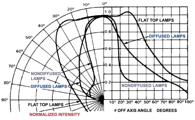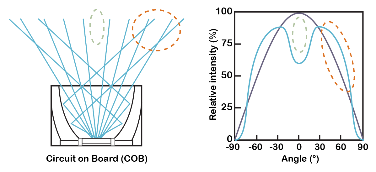 Reflectors cause convergence leading to complex dispersion angle plots (blue) when compared to a Lambertian cosign response (purple)
