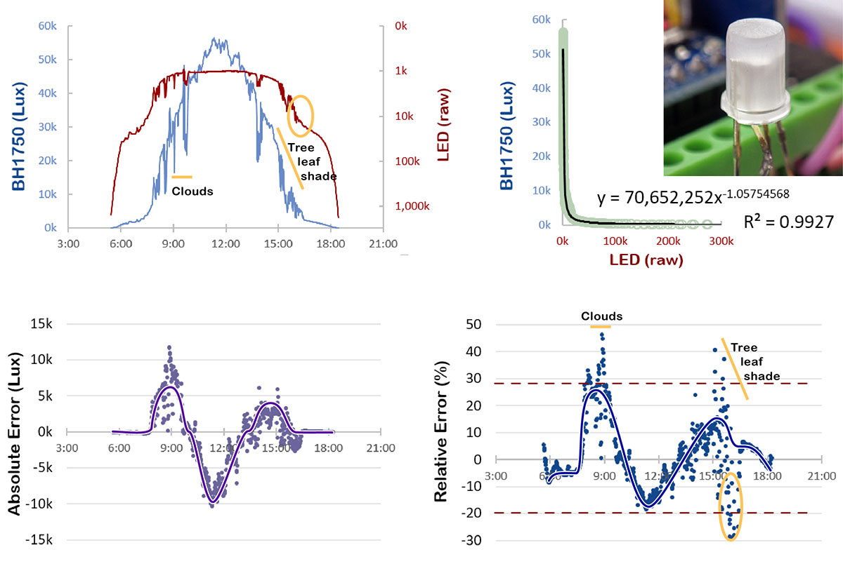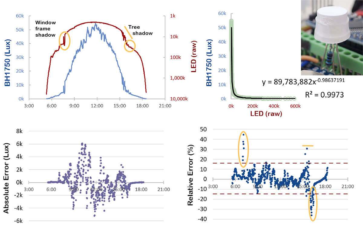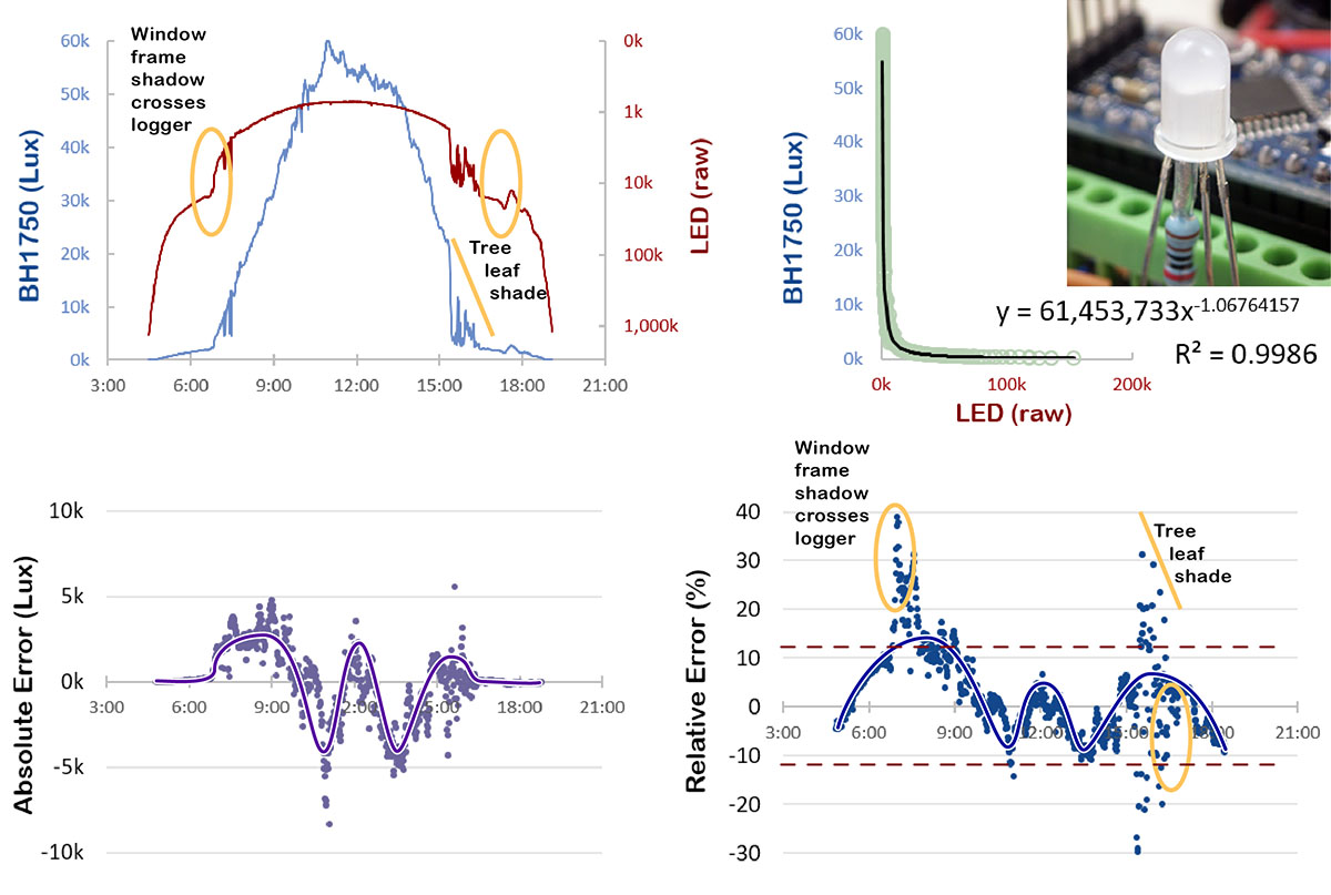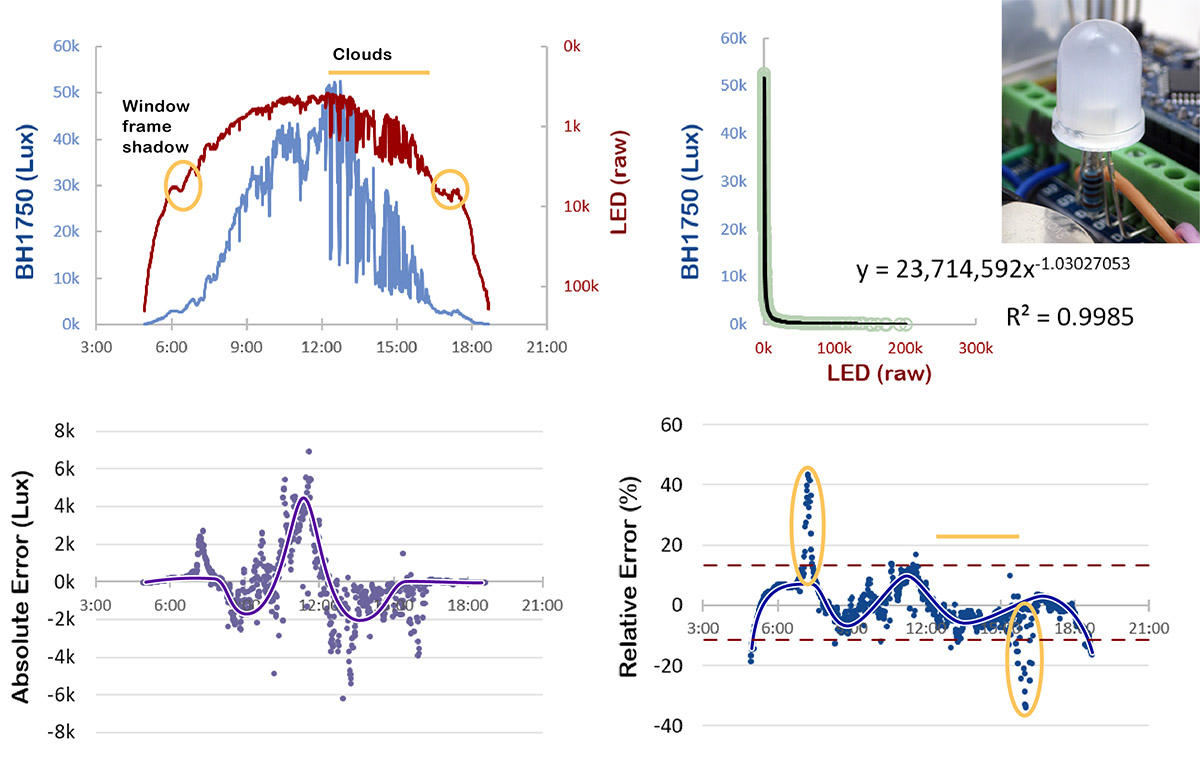 After omitting the shadow-cross events (orange circles), the 5mm clear LED has large % errors due to strong focusing of the lens when the sun is directly above the emitter. This LED would make a terrible ambient light sensor, but the curves are so well defined that with a little work it could be used to determine the angle of the sun as it progresses across the sky without any moving parts.