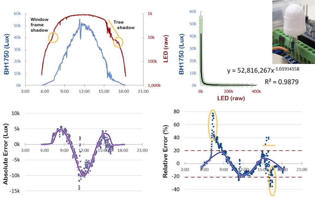 Readers of this post might also enjoy the tutorial we developed on how to cross-calibrate a Bh1750 lux sensor to measure PAR (Photosynthetically Active Radiation). This was done with natural sunlight and a clear sky model calculation, which provided some challenges. But there are many alternative references that could be used, and the most important aspect of the procedure was the mechanism we created for leveling the sensors – which is absolutely required. I also found another paper that characterizes some single-color LEDs as photodetectors.