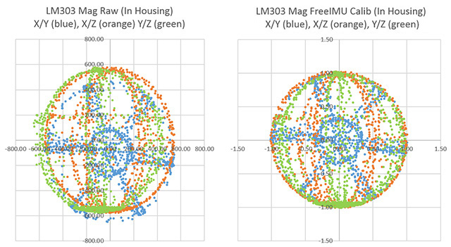 The first “inHousing” test with the LM303 showing significant soft iron distortions