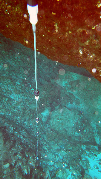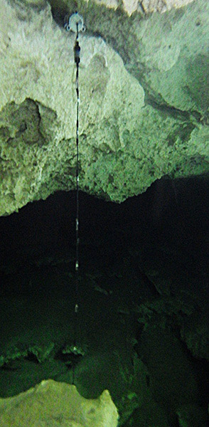 We recently had a chance to test the first prototype (with the separate individual nodes) out in open water. To make sure the connections were up to the challenges of “normal” fieldwork, I let students handle & install the unit, with no specific instructions other than letting the last sensor just rest on the bottom. (yes, I cringed a few times…) The lowest sensor was at 6.5m depth, and the unit gathered temperature data in a saline water outflow for about 7 hours with no leaks or problems. On the same trip we also deployed two “clear epoxy tube” chains in a different cave system spanning depths from 7 to 14m. I don’t have any photos as that deployment was significantly deeper, and beyond the reach of our little point & shoot. Both of those carried 12 x AA batteries, and the plan is to leave them running in-situ till mid year, at which point I should have a pretty good record of power consumption of these long sensor strings.