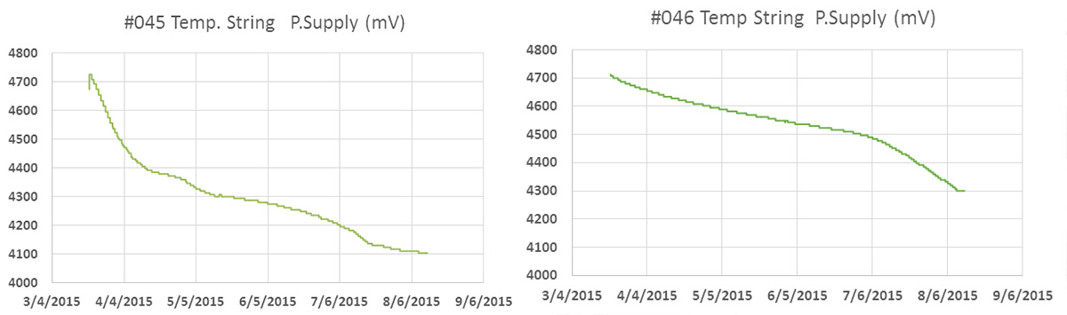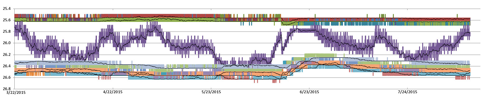 Because the DS18’s run on fumes when they are not doing a conversion, this logger slept at 0.11 mA. The units currently in the field have more sensors and longer cables, but seeing that less than half of a three cell battery’s capacity was used on this two month run gives me confidence that the 12 cell loggers we deployed had far more power than they needed. So the only real question is how long they remained water tight* with the crummy epoxy used on some of the nodes. If I am lucky, the marine heat shrink tubing I used for physical re-enforcement will have provided a water tight seal on those ends.
