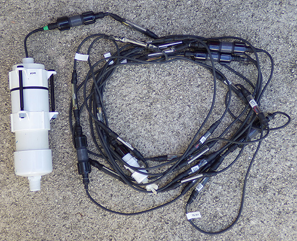 A dual connection cap for one of our 2″ underwater housings. We now use harder PUR sheath cables because softer silicone jackets were too easily damaged during deployment dives. For a less expensive option, Luke Miller has had success using USB cables with his underwater sensors. A 3/4″ adapter from the pex connector system gives you a way to mount pressure sensors under oil.