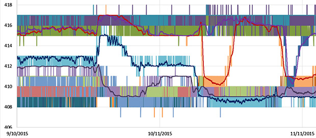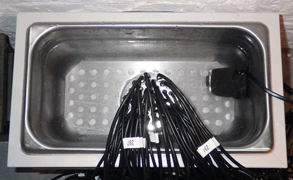 You should always do a final test to validate your calibrations, because even when the data is good it’s easy to make a typo somewhere in the process. Here, a set of nine calibrated NTC loggers are run together for a few days in a gently circulatingwater bath at ambient temperature –>