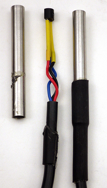 The trick is to seal one end of the clear tubing first, and then injectthe epoxy into that from the open end. Once the tube is about 2/3 full 0f epoxy, shrink the upper open end of the tubing down to it’s minimum diameter. Very gently heat several spots along the tube – as those areas contract it pushes the epoxy up toward the open end. Then wipe away any excess so the meniscus is level, and seal the upper end of the outer tube to the cable with a short section of adhesive lined heat shrink tubing, making sure that you trap as few bubbles as possible. I usually use adhesive lined heat shrink for those two end tubes, and I let the upper ring completely cool so that if forms a good seal before heating the rest of the clear heat shrink tube. I usually use Loctite E-30CL epoxy as this sets much more quickly after the reheating process, often becoming hard in about 30-45 minutes. This approach to mounting the sensors would also work with ‘naked’ Ds18b20’s, but having the sensors already mounted in the stainless steel sleeve makes it much easier to do the ice & steam point calibrations before you commit to actually using a particular sensor. At only $1.50 each, you should expect to triage at least some of them for being out of spec.