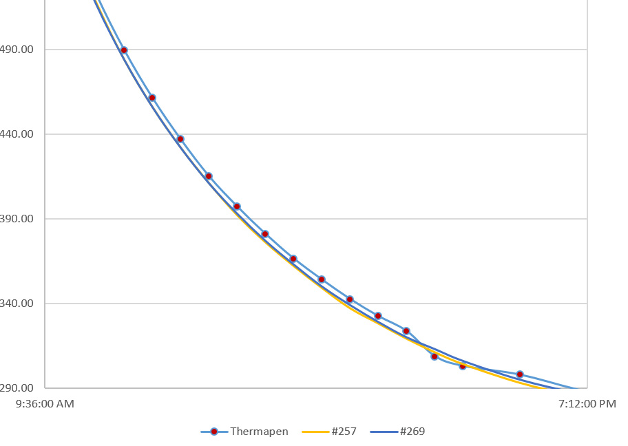 Si reference & NTC calculated temperatures: If your calibration has gone well, the curves should be nearly identical as shown above. With exceptions only in areas where the temperature was changing rapidly and the two sensors got out of sync because of different thermal lags.