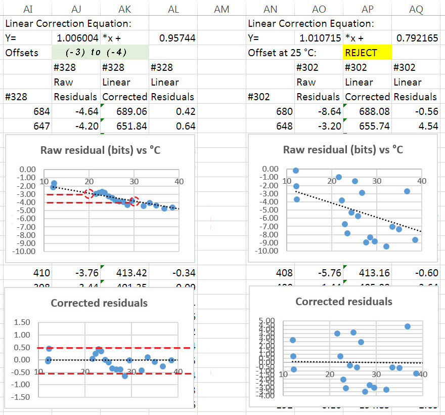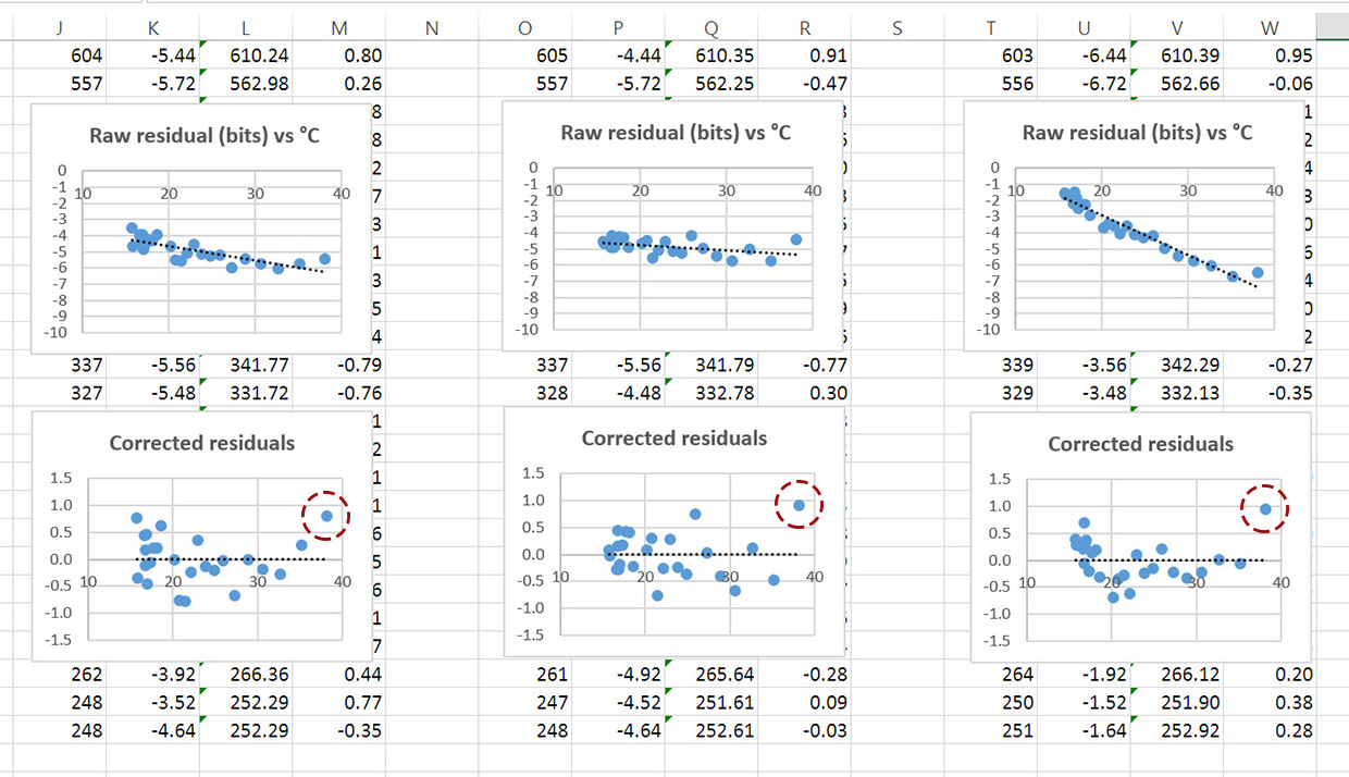At this point I am still doing tests & chewing on numbers, but the standard deviations around the mean line are being reduced by this ice&steam point calibration. The problem is that even after I apply the resulting slope and intercept I still have significant residuals from a mean that is derived with the corrected numbers. I thought that the two point calibration would make the graphs the individual sensors line up very closely with one another, and that they would have nearly identical slopes(?) I am left wondering if larger sensor errors up at 100°C mean that I need to apply some additional process to normalize my sensors to each other in the 30°C range after doing the two point calibration. But using the process I described above would generate ‘b’ value corrections, and I am very reluctant to modify my y intercept numbers because I think using the ice point to measure that offset is robust. These doubts about accuracy of the steam point, the sensors linearity, and my lack of a nice “mid-range” standard to calibrate against, have me hunting for a method which would gracefully combine a single (ice) point calibration with normalization. And the dip in the datasheet’s mean error curve between 20-30°C implies that even after applying ice point corrections my average line will still be 0.05°C lower than actual (?)