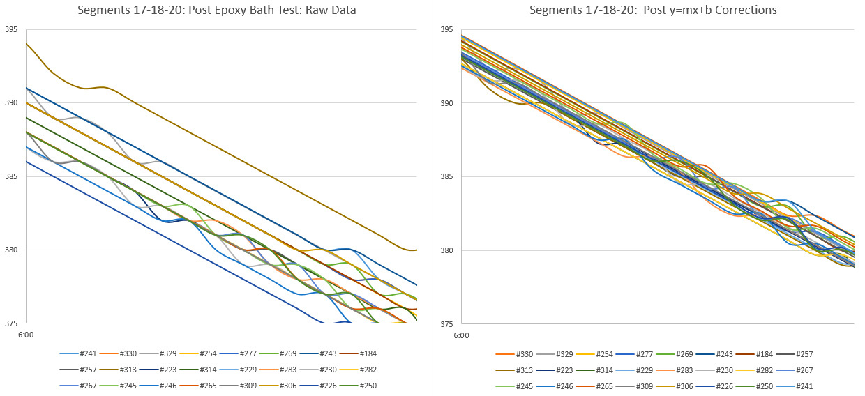 And finally, the procedure described here is not ‘normalization’, which people sometimes confuse with calibration. In fact, it’s a good idea to huddle-test your sensors in a circulating water bath after calibration to bring a set closer together even though that may not improve accuracy. Creating post-calibration y=Mx+B correction constants is especially useful for sensors deployed along a transect, or when monitoring systems that are driven by relative deltas rather than by absolute temperatures. Other types of sensors like pressure or humidity have so much variation from the factory that they almost always need to be normalized before deployment – even on commercial loggers.