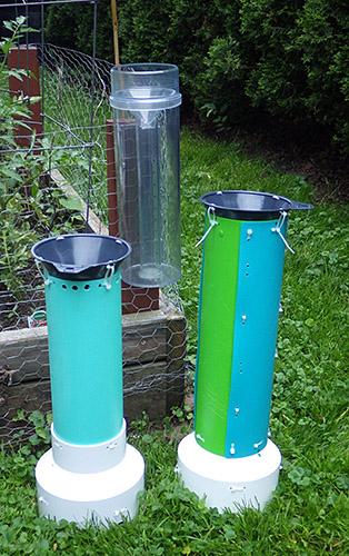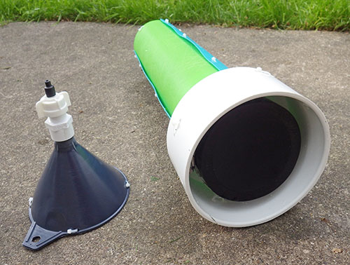 During outdoor tests some of the the small grey catchment funnels became plugged up with leaf litter. Since I needed a larger diameter catchment funnel to conform to the NOAA standards anyway, I found an 8 inch nylon brewing funnel on ebay that had an integrated strainer, and set up another comparison test in the back yard. I left the units running for almost two weeks and nature obliged with a few good rain storms to give me a decent data set.