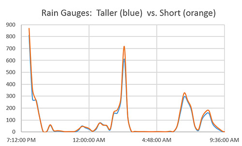 A riser tube then holds the catchment funnel sufficiently far away that the drops gain some momentum and these funnels do a good job of converting fine misty rains into drops big enough to trigger the sensors. As usual, everything is held together with cable ties so that it can be disassembled for transport. I picked up an old school Stratus rain gauge to calibrate the loggers and set everything up in the back yard just in time to catch a few summer thunder storms. Ideally these gauges would be up off the ground, out in an open field, but my yard has few areas that are not directly covered by trees. I also noticed that high winds can sometimes shake the units enough to create false positives, so I now anchor the bases to cement blocks. Even with these sub-optimal factors, these loggers report within 10% of each other. Not USGSquality yet, but I am happy with them as prototypes. I will add a larger 8′ funnel later, to bring the loggers in line with NOAA standard rain gauges.