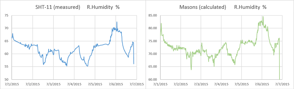 Even with the psychrometer constant bumped up to 0.0015 (0.0012 is usually quoted for non ventilated designs with warnings that the number will be different for each instrument)the Mason is reading about 10-12% above the SHT11. I can deal with that if the offset is constant, but it means that the difference between the two bulbs is smaller than it should be. That is typically the direction of errors for this kind of design but when the humidity gets up into the 90’s, my humble DS18’s might not have enough resolution to discriminate those small differences – especially if there is some ugly non-linear compression happening.You can already see some of that digital grit showing up on the green plot above. I was pleasantly surprised to see very little difference in the response time for the two sensors, although I suspect that is because they both have significant lag.