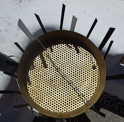 Here a ring of cut zip ties is held in place with a pipe clamp, with the shower drain screen held w plumbers epoxy putty. If those cable ties don’t hold up to the sun exposure, I will cut some more durable bird spikes from old coat-hanger wire. I also keep an eye on the weather enthusiasts forum for other ideas like cut chicken wire.