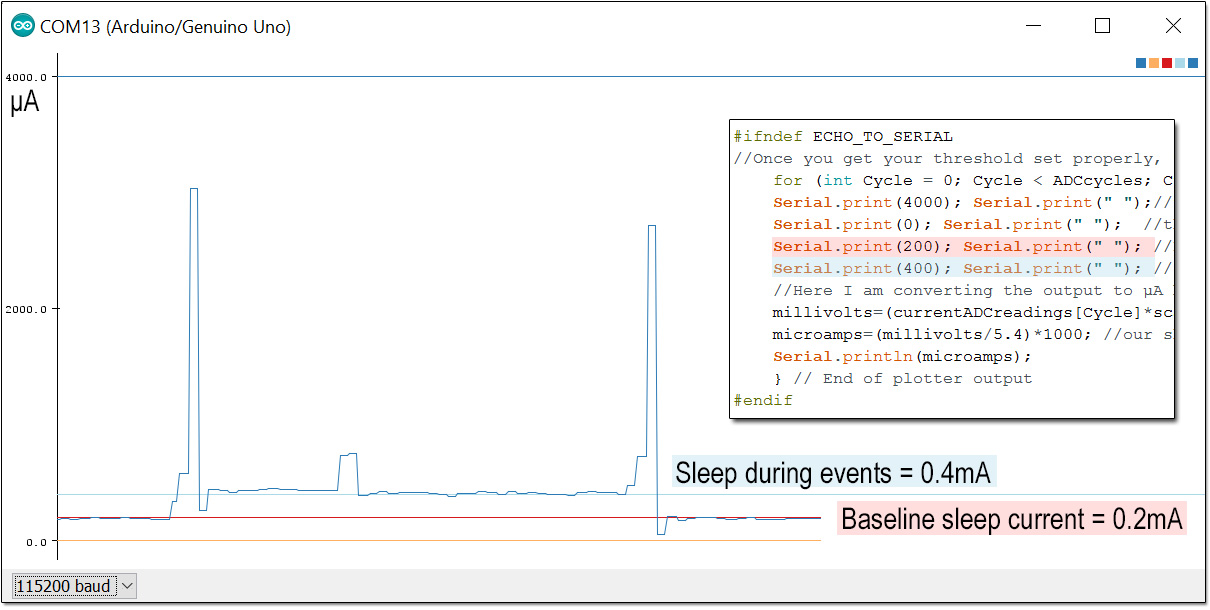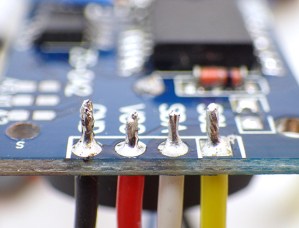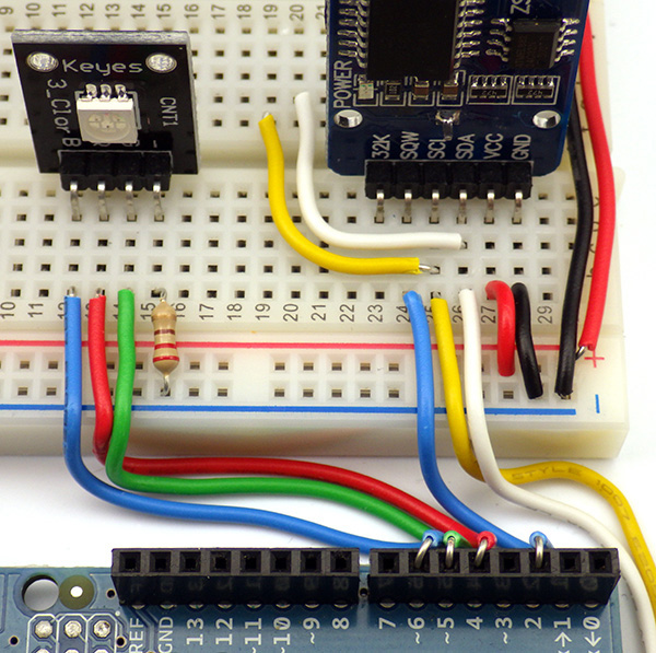 Note that the negative terminal of the IR LED is under the same screw terminal (D7) as the common cathode leg of the RGB indicator led. Columnating the LEDs with heat shrink tubing should also make them less sensitive to light reflections inside the logger. Note: our GitHub code uses a port command that assumes that shared ‘negative’ pin to be one of D3 to D7 on the pro mini. Here I’ve set #define LED_GROUND_PIN 7 as the common GND connection, RED_PIN 6, GREEN_PIN 5, and the positive side of the IR led is on pin D8. Set #define BLUE_PIN 8 to force the former blue pin code to take the IR LED reading. Also note: that our code initially ‘lights’ the indicator LED via INPUT_PULLUP mode, instead of setting the pins to OUTPUT & HIGH, so limiting resistors are not necessary for that step.