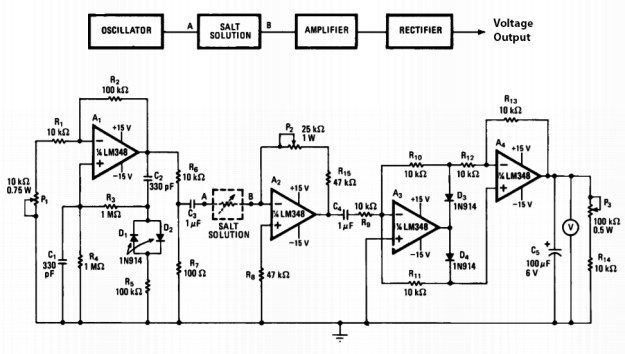 The easiest circuits to build yourself are the 555 timer oscillators, but there are plenty of quad-opamp solutions out there for people comfortable with a breadboard. The oldest example I’ve seen is this one by M. Ahmon from the Sept 1977 issue of Electronics magazine which uses the resistance of the solution to modify opamp output: