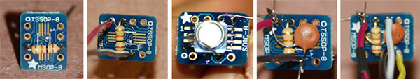 Adafruit still makes the nicest boards to work with, but the cheap eBay SOIC8 breakouts (like the one pictured above) have also worked fine and they let me mount the board in smaller epoxy wells. Leave the shared leg of the pullup resistor/capacitor long enough to jump over to Vcc on the top side of the board .