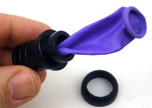 Remove the O-ring from the swivel adapter stem and insert the ‘neck’ of the balloon.