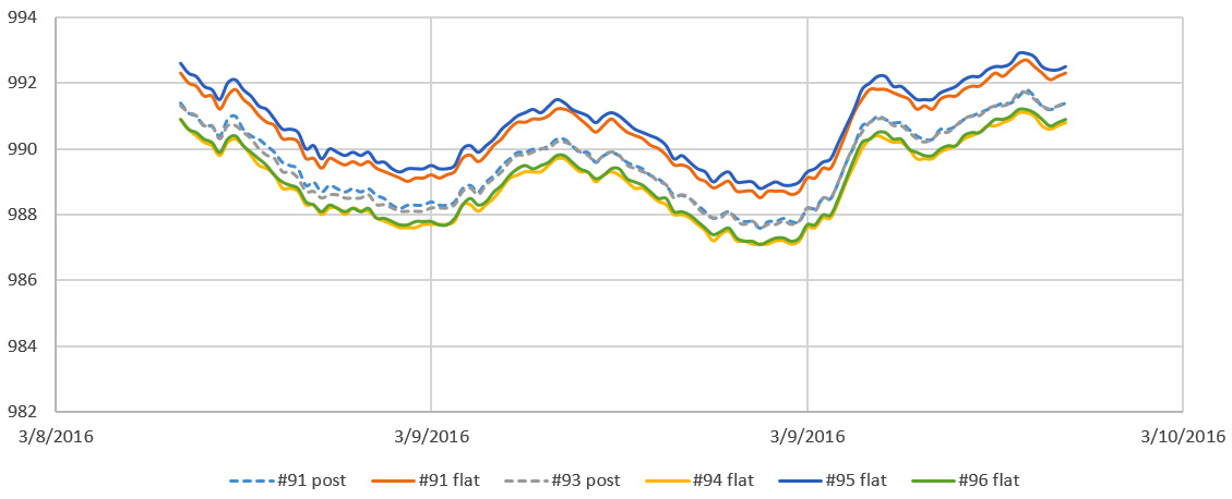 These are just quick first-order calculations (in a room above 20°C). Apparently no effect from the different mounting configurations, but by comparison to the local weather.gov records, the whole set is reading low by about 20 mbar. This agrees with the offsets I’ve seen in other MS5803 builds, but I am kicking myself now for not testing this set of sensors more thoroughly before I mounted them. Will do that properly on the next batch.