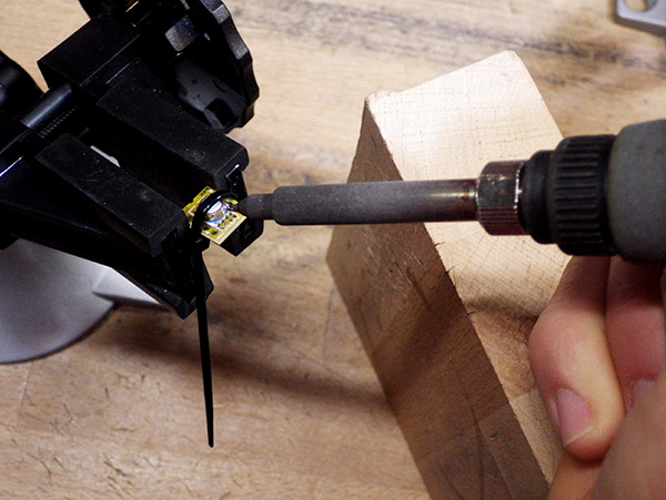 I plant the point of the iron into the small vertical grooves on the side of the sensor. I then apply a tiny bead of solder to the tip of the iron, which usually ends up sitting on top, then I roll the iron between my fingers to bring this the bead around to make contact with the pads on the board. So far this technique has been working fairly well, and though the sensors do get pretty warm they have all survived so far. If you get bridging, you can usually flick away the excess solder if you hold the sensor so that the bridged pads are pointing downwards when you re-heat them.