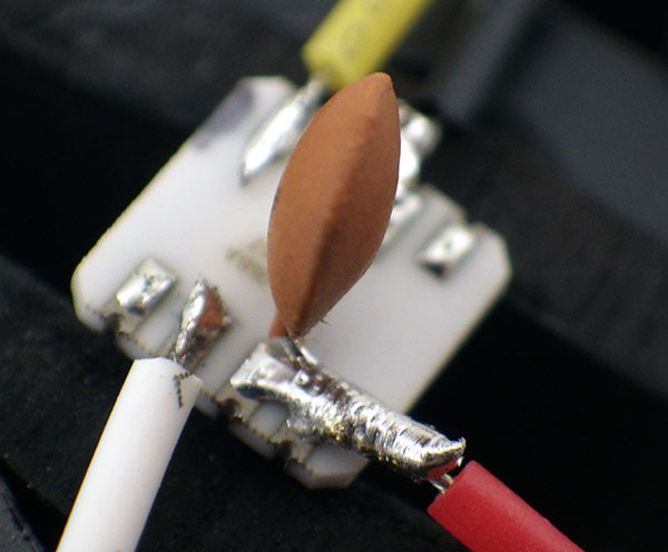 After mounting the sensor to the breakout board, I think of the rest of the job in two stages: step one is the innermost pair (which are flipped horizontally relative to each other) , and step two by the outermost pair where I attach the incoming I2C wires. Here SCL is yellow, and SDA is white. In this configuration CSB is pulled up by that resistor, giving you an I2C address of 0x76. If you wanted a 0x77 buss address, you would leave out the resistor and attach the now empty hole immediately beside the black wire to that GND line.
