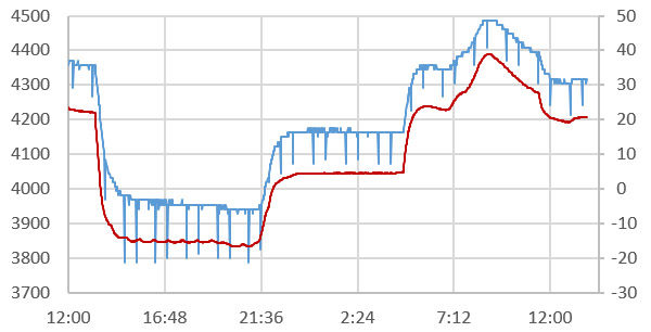 Thermal response of 3x AAA’s(mV left axis) vs Temp (°C right axis) in the standard voltage-regulated classroom build running the starter code from Github. The 90mv drops caused by SD card “controller housekeeping events” at 20°C increase to ~220mV as temps near -15°C. These periodic high drain (100-200mA) events would likely trigger the low-voltage shutdown before anything else in the loggers normal duty cycle. (Note: Battery readings taken AFTER SD save, Sample interval: 1 min, sleep current for this test unit: 0.22mA )