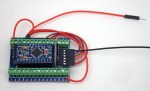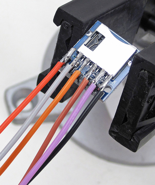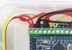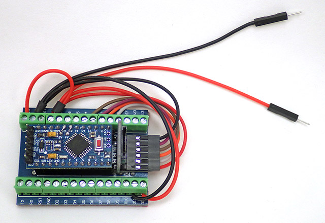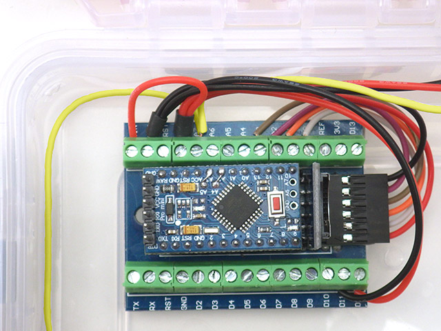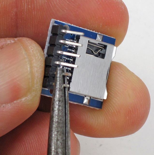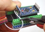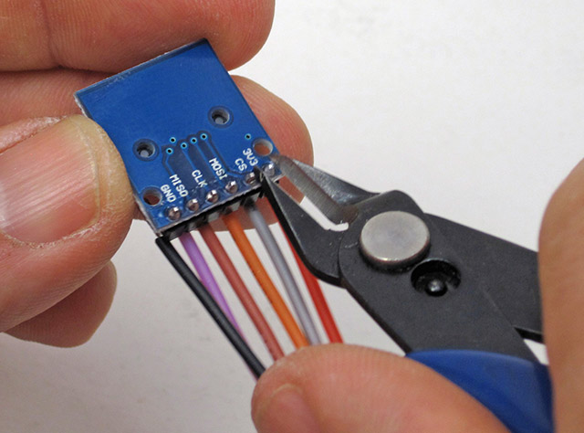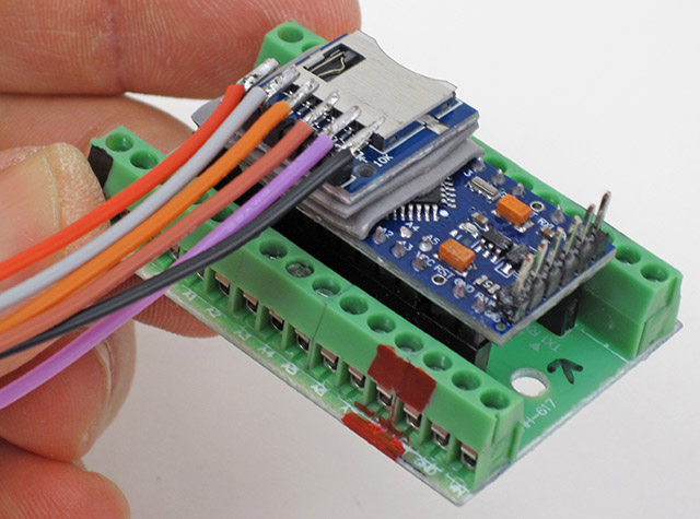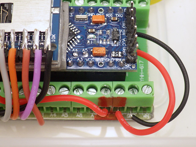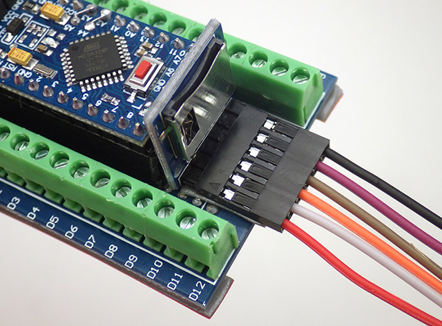 Then affix the SD adapter board to the top of the Pro Mini with a slight overhang, so that the jumper wires align with the screw terminals below. Trim the wires about 1cm past the edge of the board to provide enough stripped wire for the terminal connection.