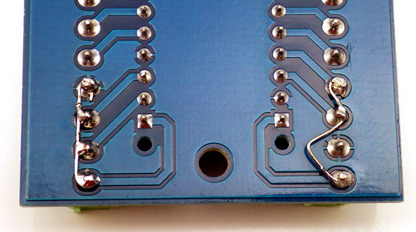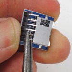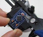 The most common beginner errors at this stage are crooked headers & not heating the pad/pins long enough for solder to flow properly. This is often because students are trying to use an iron tip that has “gone dry” so the heat is not transferring properly to the pins. You must protect soldering iron tips with fresh solder every time you put it in the stand to prevent oxidation. Tip Tinner can sometimes restore those burnt tips. {Click images for larger versions}