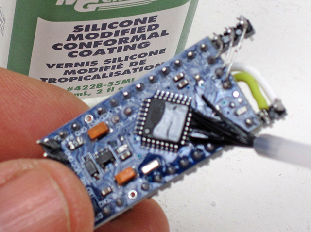 No matter what coating you use, everything must be scrupulously clean before it’s applied. Corrosion inducing flux is hydroscopic and there’s always some left hiding underneath those SMD parts – especially on cheap eBay modules. That means scrubbing those boards with alcohol and an old toothbrush, drying them with hot air & cotton swabs, and then handling by the edges afterward. Boards with only solid-state parts (like the ProMini) can be cleaned using an ultrasonic cleaner and 90% isopropyl but NEVER subject MEMS sensors or RTC chips to those vibrations. Polymer based RH sensors like the BME280, or MS5803 pressure sensors with those delicate gel-caps, also get careful treatment. After cleaning, let components dry overnight in a warm place before you coat them with conformal. I clean new modules as soon as they arrive, and store them in sealed containers with desiccant.
