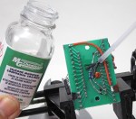 MG Chemicals 422-B Silicone Modified Conformal Coating is the one we’ve used most over the years. Even with a clean board, adhesion to raised ICs can be tricky as surface tension pulls it away from sharp edges. Like most conformals, 422-B fluoresces under UV-A so a hand-held blacklight lets you check if it’s thin at some corner, or if you simply missed a spot. The RC/Drone crowd regularly report on many of the other options on the market like Corrosion-X, Neverwet, KotKing, etc. I’ve never seen a head-to-head test of how well the different conformals stand up over time, but the loggers we’ve retired after 5-6 years in service look pretty clean even though silicone coatings are not water vapour proof. I like the flow characteristics of 422 for our small scale application, though the vapours are nasty enough to make you wonder how much brain damage your project is really worth. You can also just burn the stuff off with a soldering iron if you need to go back for quick modification after its been applied. Conformals can be made from other compounds like acrylic or urethane, and at the top of the market you have vacuum-deposited coatings like Parylene.