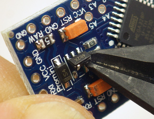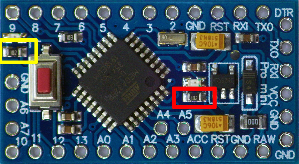 ~5-10% of the cheap Pro Mini clones from eBay are flaky, and it is quite annoying to discover one of those that after you have assembled a logger. So test your board with the blink sketch before you remove pin13 LED resistor. These limit resistors move around from one manufacturer to the next, so you might have to go hunting for them on your particular board. You also need to remove the RESET switch from the board, or that button will be compressed when you put the SD card adapter in place:
