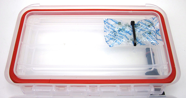 We’ve found that the seal on some of the Plano boxes needs a little help, or current leakage via surface moisture shorts out the LED light sensor readings. In the worst cases leakage lets in enough water vapour to chew through your desiccant pack in less than a week. A little bead of silicone under the o-ring corrects that problem:
