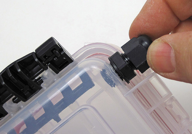 In these photos, I’ve melted threads into the housing for a pass-through with a cable gland, but that is entirely optional. This trick works with many different housing materials, but it takes a bit of practice to figure out what the right temperature is for any given one. The plastic in the plano boxes melts quite easily, so be gentle with the heat gun. Glands much larger than PG7 (12mm) will not fit in the available space in that corner.