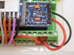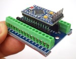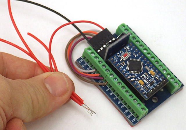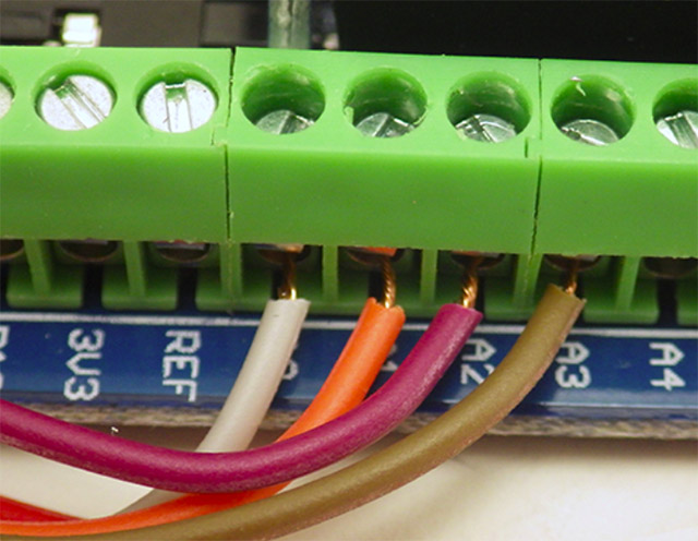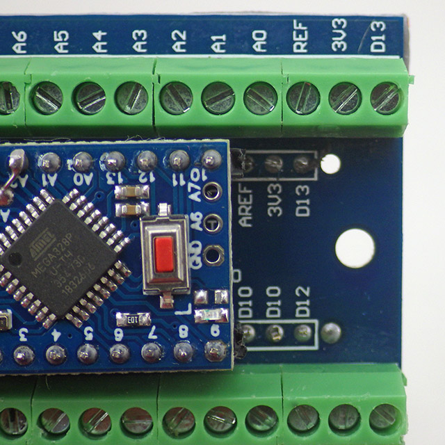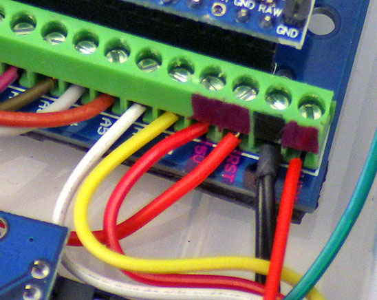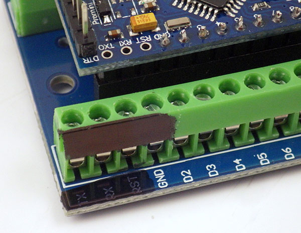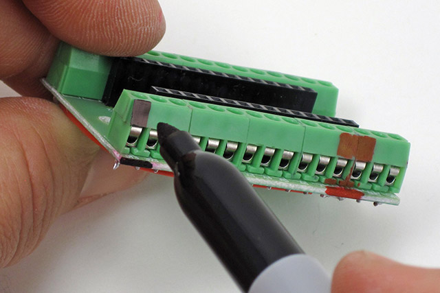 Label the Vcc & GND connections with a colored marker, then insert the Pro Mini into the headers on the screw-terminal shield. Be careful not to bend the pins – especially the “extension” pins at the back of the board. It’s easy to connect the board in the wrong orientation at this step. The voltage divider on the bottom of the screw terminal shield aligns with the ANALOG side of the Promini board.