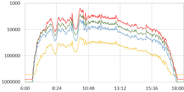 Readings from an RGB LED deployed outside in our back yard on an overcast day with two light snow fall events. The yellow line is from an LDR sensor in the same logger that was over-sampled to 16-bit. In this case the clouds & snow acted as a near perfect light diffuser, but in normal weather I’d have placed a thin white teflon sheet over the LED sensor to smooth out the readings. Adding an IR led to the logger lets you create a transmission-based NDVI variant that discriminates the amount of chlorophyll in plant leaves.
