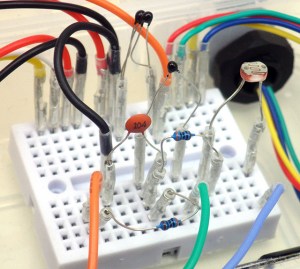 We’ve also added support to the starter code for using the indicator LED as a light sensor, but this requires that you ground the indicator LED’s common cathode through a digital pin (usually D3) , rather than directly to GND as shown in the tutorial above. Also note that the technique relies on the very tiny internal capacitance inside the LED (typically 10 to 15 pF) so you need to connect the LED right to the screw terminals (ie not the breadboard). Then you can gather three-channel light level data like this: