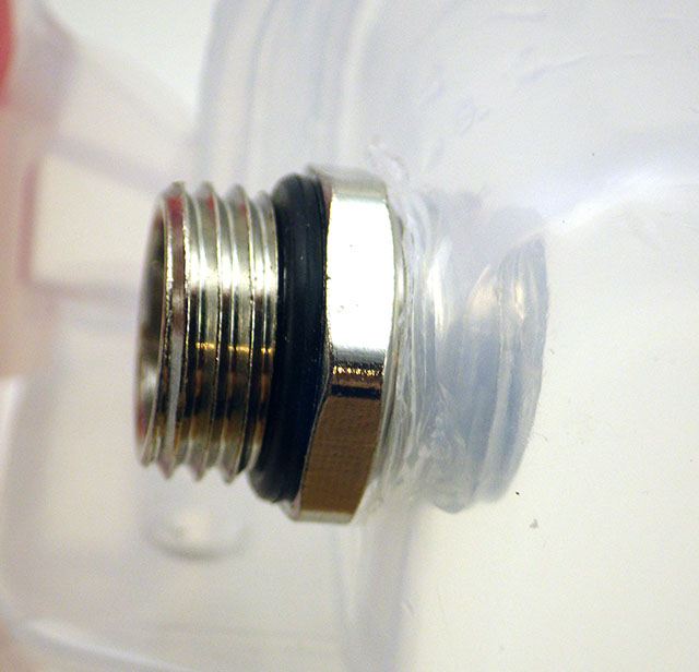 The MS5803 pressure sensor is epoxied into a 1/2″-3/4″ male PEX adapter and a nitrile finger cot is inserted into the stem of a matching swivel adapter.
