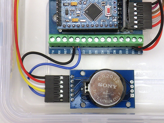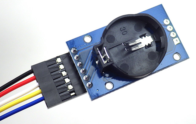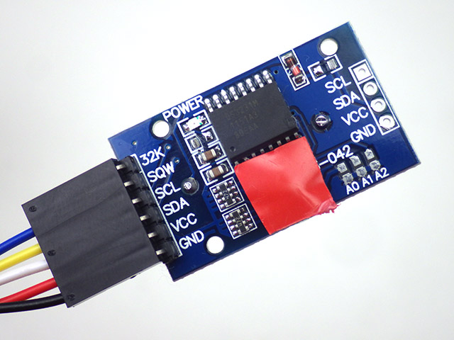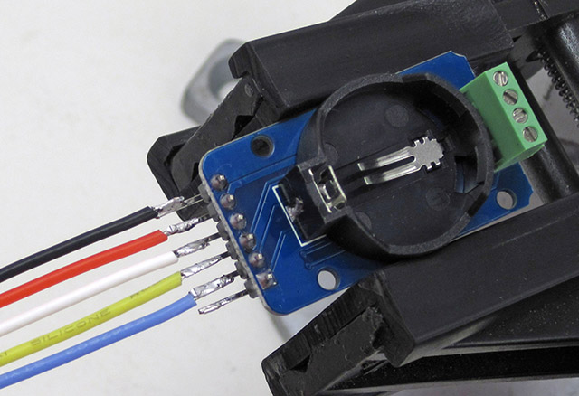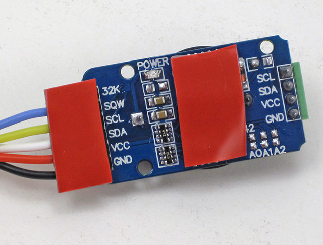 Add an extra layer of foam tape over the smaller 4K eeprom chip, so that the thickness matches the top surface of the DS3231 chip. The RTC board already has 4.7kΩ pull-ups on the SDA (data) and SCL (clock) lines so you will not need to add them to the bus. This module also has a 4.7k pull-up on the SQW alarm line. Adding the screw terminals to the small cascade port on the RTC module is another creative idea from Brian D, but you could just add straight pin headers: If you don’t want to make your own crimp ends, 4-pin JST XH series connectors have a pitch of 2.5 mm which is effectively identical to the 0.1″ pitch of those Dupont pins.