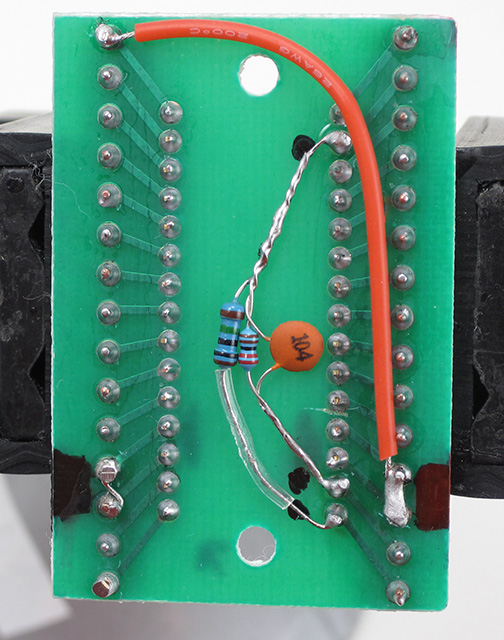 This SD card adapter comes with small surface mount pull-up resistors on the MOSI, MISO & SCK (clock) lines(removed from the dashed red line area photo 2 below). The Arduino SDfat library uses SPI mode 0 communication, which sets the SCK line low when the logger is sleeping. This would cause a constant drain (~0.33mA)through the 10k SCK pullup on the module if we did not remove it. I prefer to pull MOSI & MISO high using the internal pull-ups on the Atmel328P processor, so those physical resistors on the breakout board can also be removed. Leave the top-most resistor of the four in place to pull up the unused DAT1 & DAT2 lines. This keeps those unused pins on the SD card from floating, which can draw excess current.
