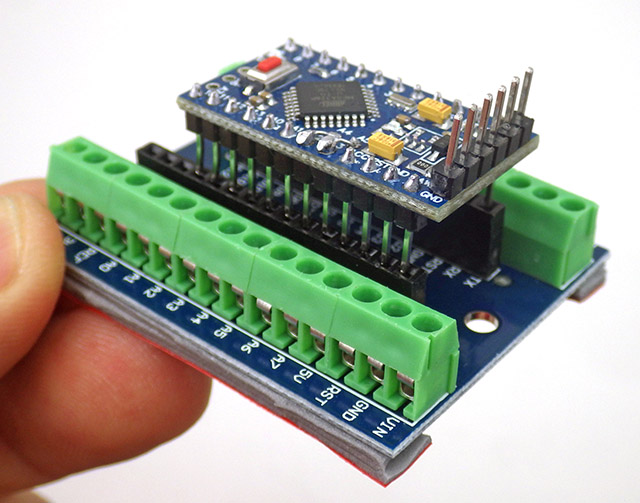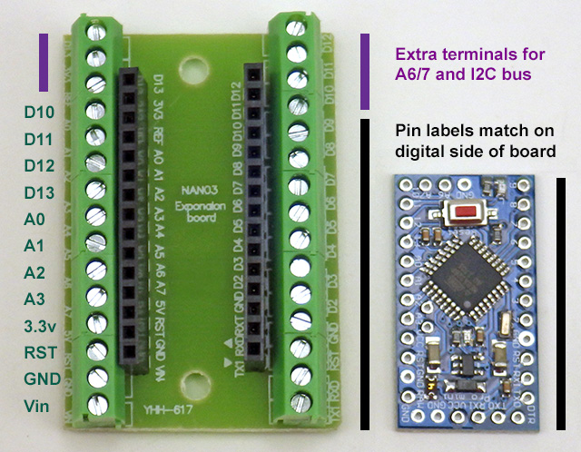These screw terminal boards are designed for an Arduino Nano, but if you orient the board to the Tx/Rx pins, the labels on digital side of the shield will be correctly aligned with the Pro Mini: