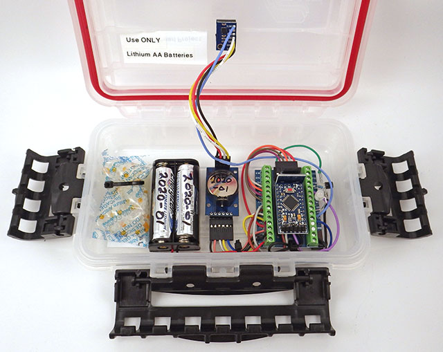 The $5 3440 Plano Box housings we use on the classroom loggers stand up to the elements well enough in summer months, but rarely have an adequate seal for the temperature swings in fall or winter. Judging by this post over at AVRfreaks, this is a common issue with most of the premade IP68 rated housings on Ebay/Amazon.