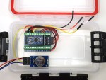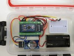 Screens are quite readable through the clear 3440 Plano Stowaway boxes used for ourclassroom logger. (here I’ve hot glued them into place on the lid) Avoid taking new sensor readings while information is being displayed on the OLED screens because they ‘pulse’ power to the pixels (100ms default) when information is being displayed.Each screen shown here peaks at about 20 mA (this varies with the number of pixels lit) so you could be hitting the rail with a high frequency load of about 40mA with dual screens – which could cause noise in your readings unless you buffer with some beefy caps. Also note that the screens tiny solder connections are somewhat fragile, so avoid putting hot glue on the ribbon cable.