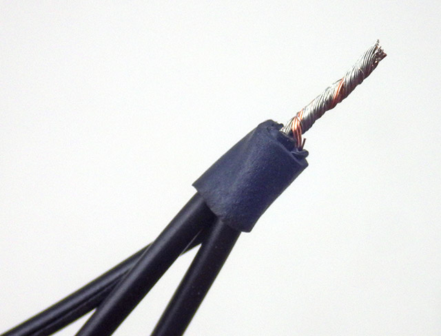 A short piece of adhesive lined heat shrink seals one end of the clear tube to the cable. Epoxy is added to fill about 1/3 the volume. Then gentle heating shrinks the clear tube from the bottom up until the epoxy just reaches the top. Another adhesive lined ring seals the epoxy at the top of the tube. Then gentle heating of the clear heatshrink contracts it into a smooth cylinder. Extra rings are added to strengthen the ends.